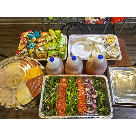 Sandwich tray, Standard Salad full pan, half pan of mac and cheese, Assortment of Deep River Potato chips and 2.5 gallons of Iced Tea or Lemonade.